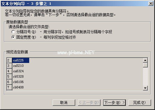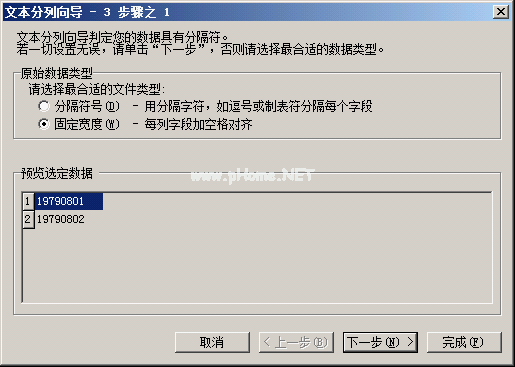 2.选择测试号列数据执行“数据”和“列”。从弹出的步骤1对话框的原始数据类型选项中选择“固定宽度”。