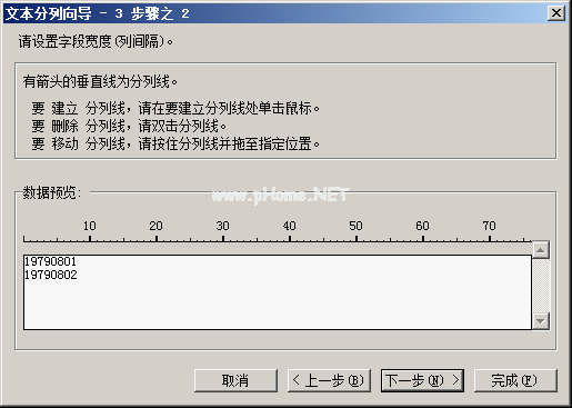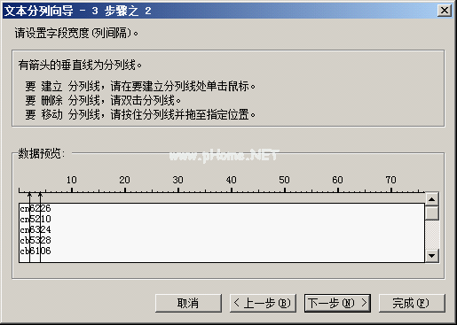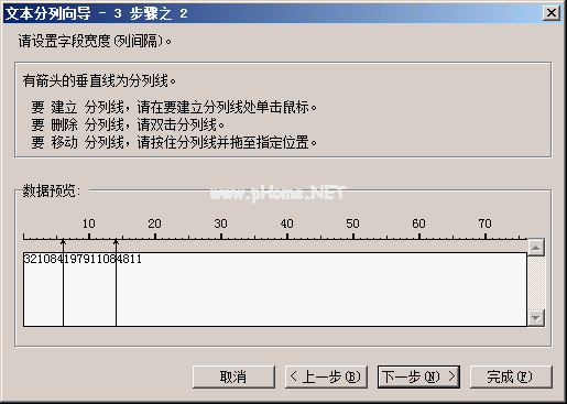 3.转到下一步并设置字段宽度。在步骤2的对话框中,查看用于表示数据宽度的数轴,单击刻度2和4的位置,将出现向上箭头指示的列线。如果要清除列线,可以双击它。如果要移动列线,请按住并将其拖到指定位置。