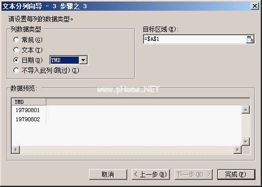 操作同上,只是执行第三步时可以跳过其他数据(选择“不导入此列”),出生日期格式为“日期”,下拉列表中选择“YMD”(YMD表示按年、月、日排序)。
