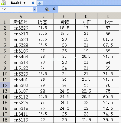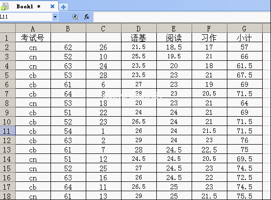 考试号由三部分组成:学校代码(cn,cb),班级代码(51,52,61,62)和学生代码(01 ~ 48)。我们现在要做的就是把它们分开,进行下一步的分类和总结。
