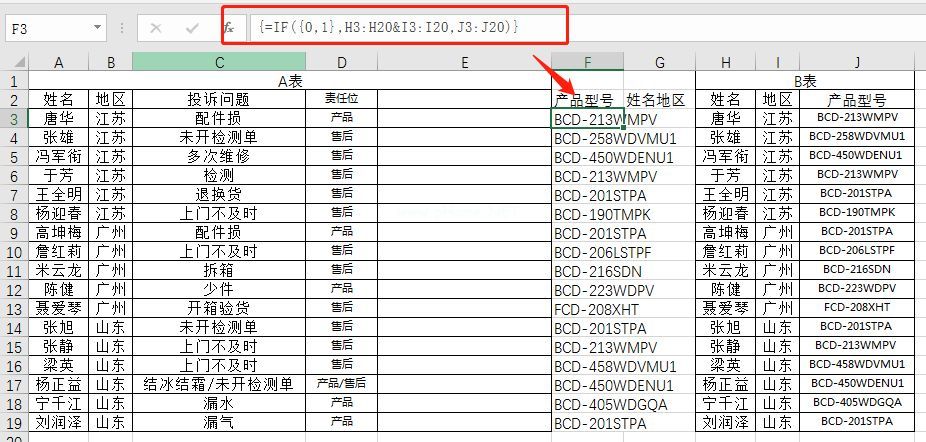 实际上,我们可以在表A和表B中插入辅助列,将名称和区域合并到一个单元格中,然后使用vlookup。