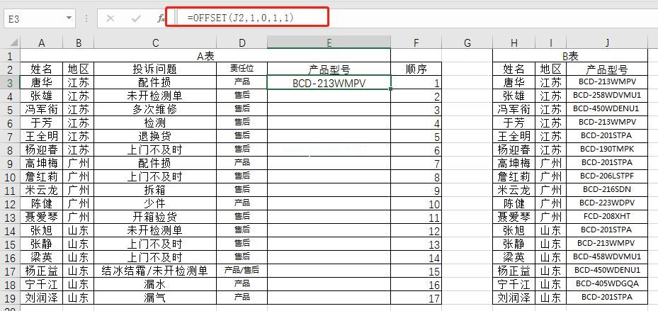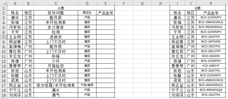 这里有一个例子可以和大家分享几种常用的多条件查询方法。下表是某电商公司的客户投诉表。现在,您需要按照表A中的客户名称和地区查询表B中的产品型号,然后返回到表A中的E列.