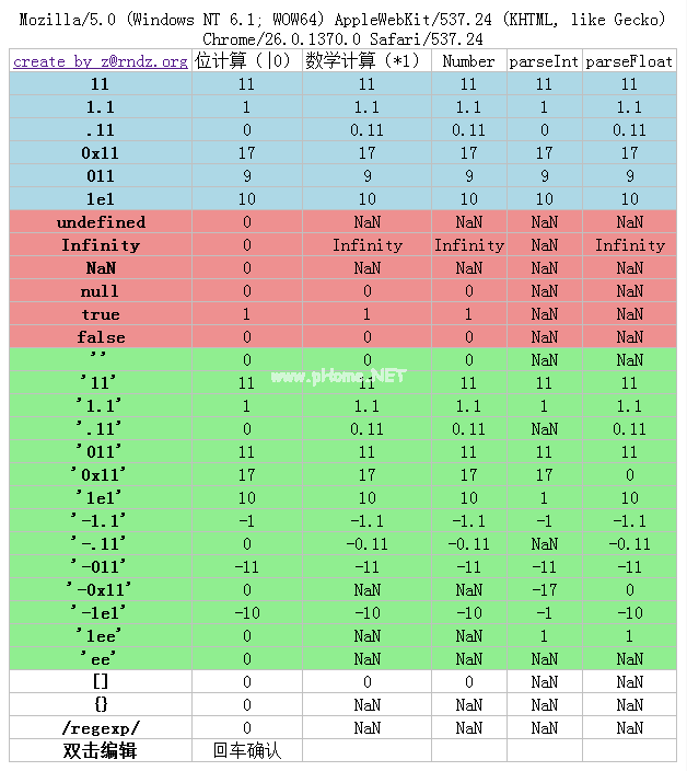 JS将数据转换为数字有三种类型和五种方法,包括:强制转换,将JS的基本数据类型转换为对应类型的原生函数(number (v))。这两个函数有不同的结果(parsent(v,radix),parseFLOAT (v)),JS在执行时会将变量转换成相应的类型(位计算,数学计算)。JS中的特殊值包括以下内容。Undefined,undefined,这是当变量被声明但未被赋值或者对象不存在时的属性值。NaN/Infinity,这是两个顽固的“数字”(typeof==number),分别代表非数字和无限数字。好像没用。如果转换为数字失败,返回值基本上是NaN。null,用作零值的对象(typeof==object)。true/false,布尔值,表示true和false,相当于1/0。对于字符串,也可以根据内容进行细分。根据JS数值表达式,可以分为合法和非法。法定数字有几种不同的分类方法:符号:正号、负号、无符号基数:八进制、十进制、十六进制科学记数法十进制、整数、十进制的缩写。根据上面的分类,我做了一个Demo来测试不同方法和数值转换的结果。下面的截图显示了chrome下的转换。