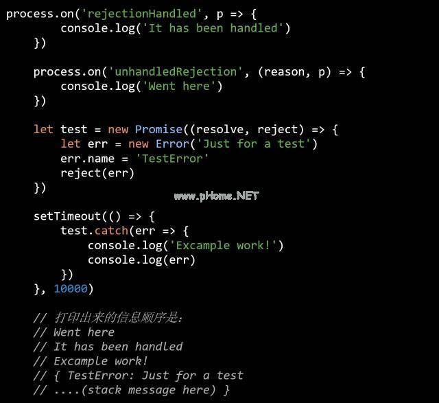 3.然而,有时当一个程序运行时,它是不可能尝试的.catch适用于所有函数操作,并且不能保证程序运行时没有bug,但是它必须能够捕获并报告这些异常。因此,两个大BOSS :未处理的拒绝进程的未排除必须在程序的最外层引入,越靠前越好。此外,对于unhandledRejection,为了防止不必要的拒绝被报告,当收到事件时,先存储被拒绝的承诺和错误,设置时间maxTimeout,在maxTimeout之后报告rejectionHandled承诺事件。