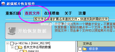 6.如何找到文件?可能有许多扫描的文件。如果你想在众多文件中找到一个你想还原的文件,可以根据文件名找到。点击软件左上角的“查找文件”按钮,输入文件名或扩展名如“*”。jpg”,然后单击“确定”列出许多候选文件。您可以按文件名或文件日期对它们进行排序,并且可以快速找到所需的文件。