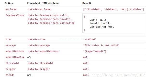$(文档)。ready(function(){ $(表单选择器)).bootstrapValidator({排除:反馈图标:live: "已启用”,消息:此值无效",Submit buttons 3360 " button[type=" Submit "]",submitHandler: null,trigger: null,字段s : {字段名称: {已启用: true,消息: "此值无效",包含: null,selector: null,//将验证程序名称与其对应.验证器名称:验证器选项.} } .} });});下面针对一个简单的表单来进行说明: