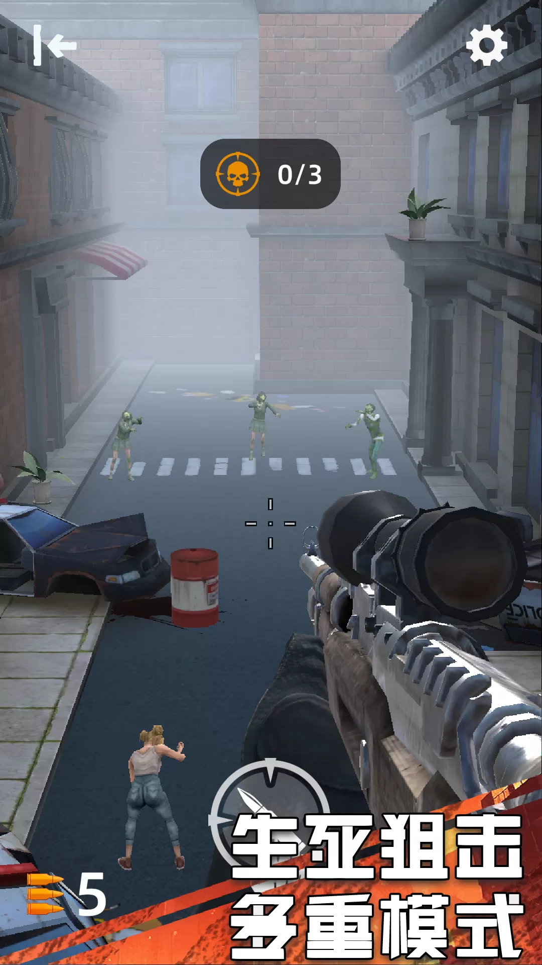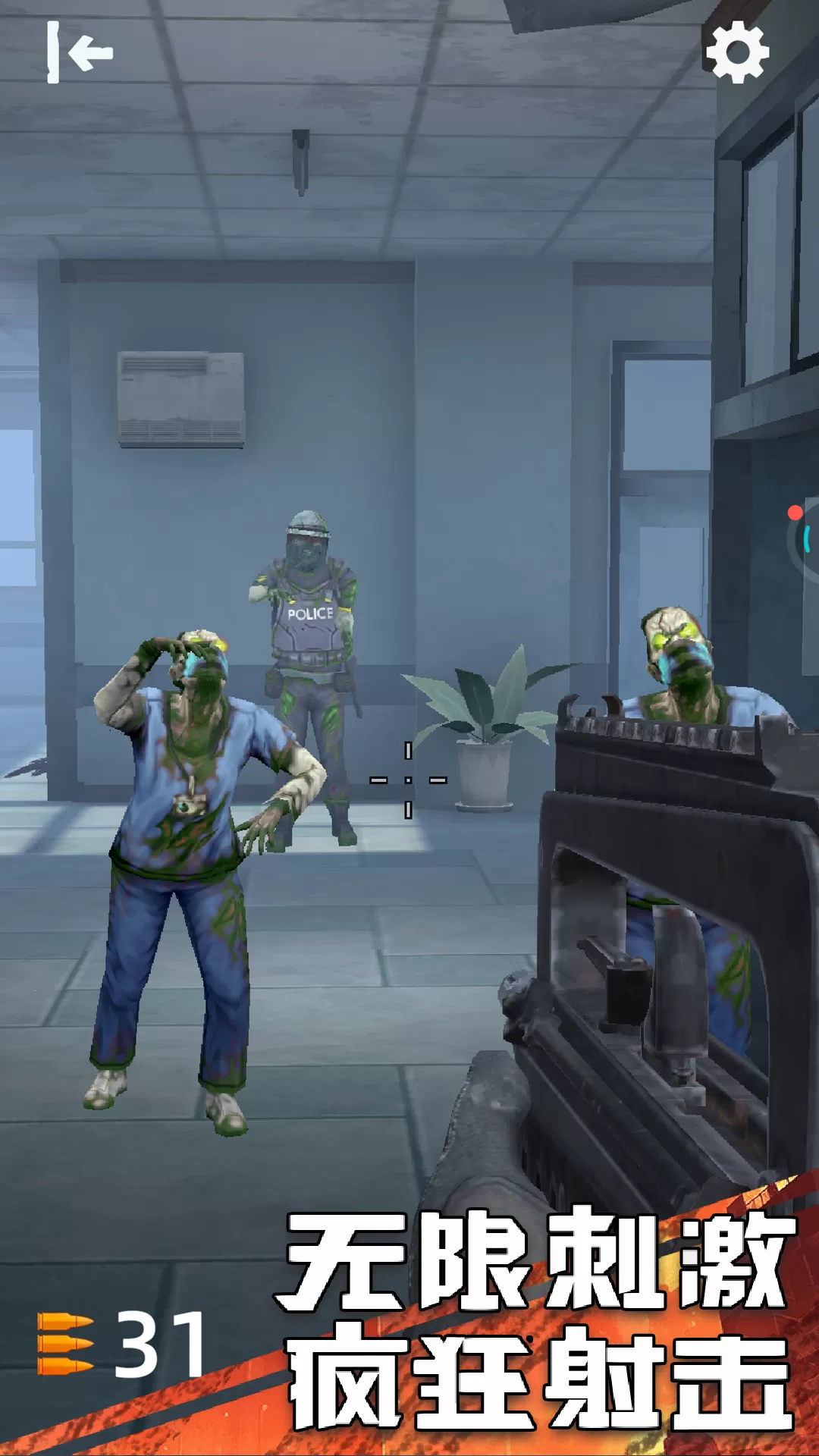 1. 生存射击模式:在限定时间内抵挡住不断来的僵尸,尽可能生存更久。