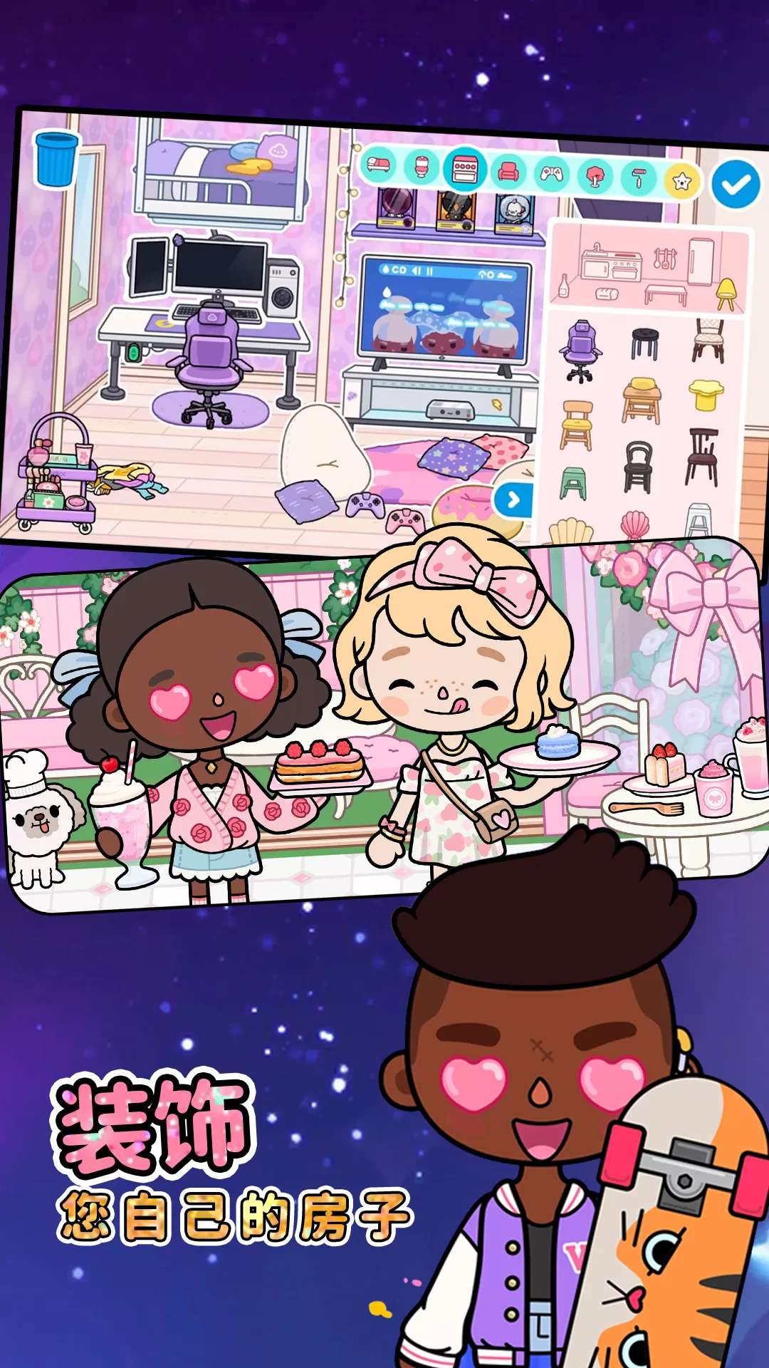 1. 多样化场景:游戏内置多个生活场景,如学校、商店、医院和动物园,玩家可以自由切换体验不同生活场景。